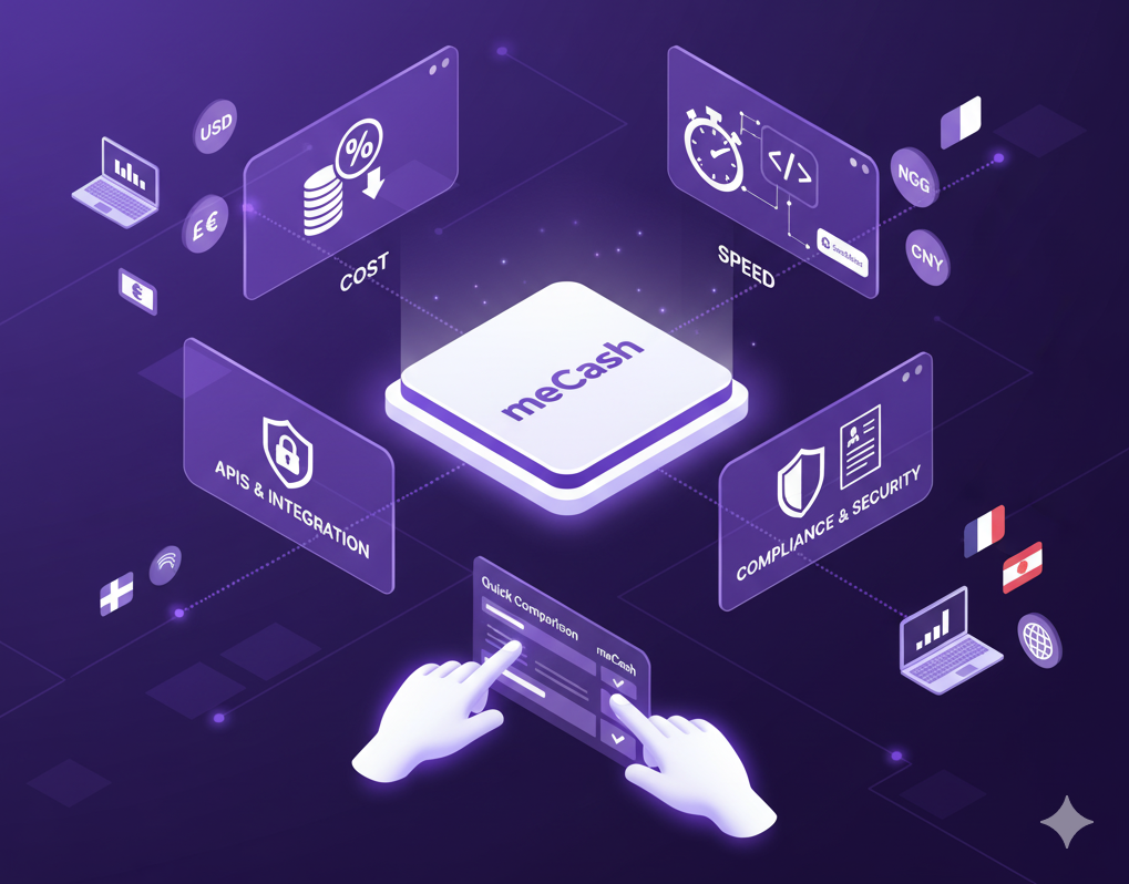 From traditional banks to fintech innovators and wallet platforms, the choices can feel overwhelming. Let’s look at how to evaluate them based on cost, speed, APIs, and compliance—and why meCash offers the best of all worlds.